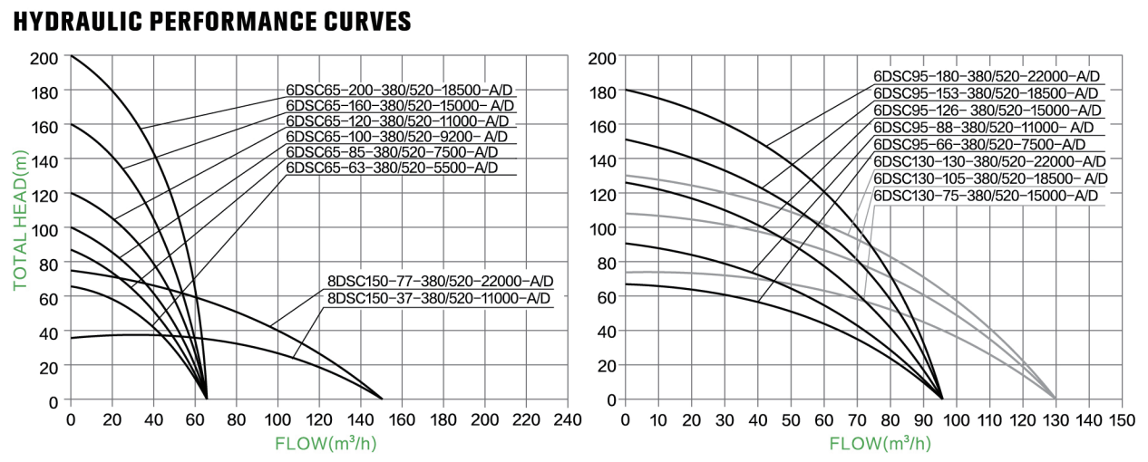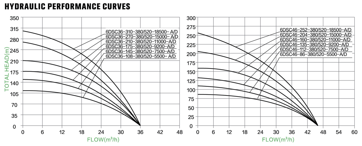 6"AC/DC Brushless Solar Pump with Stainless steel Impeller Hydraulic Performance Curves