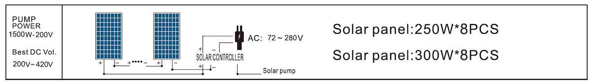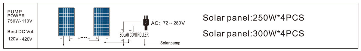The solar PV system voltage needs to meet the voltage range in the figure below. For example: The 4DPC6-56-220/300-750-A/D model matches the solar panel voltage between 120V~420V.